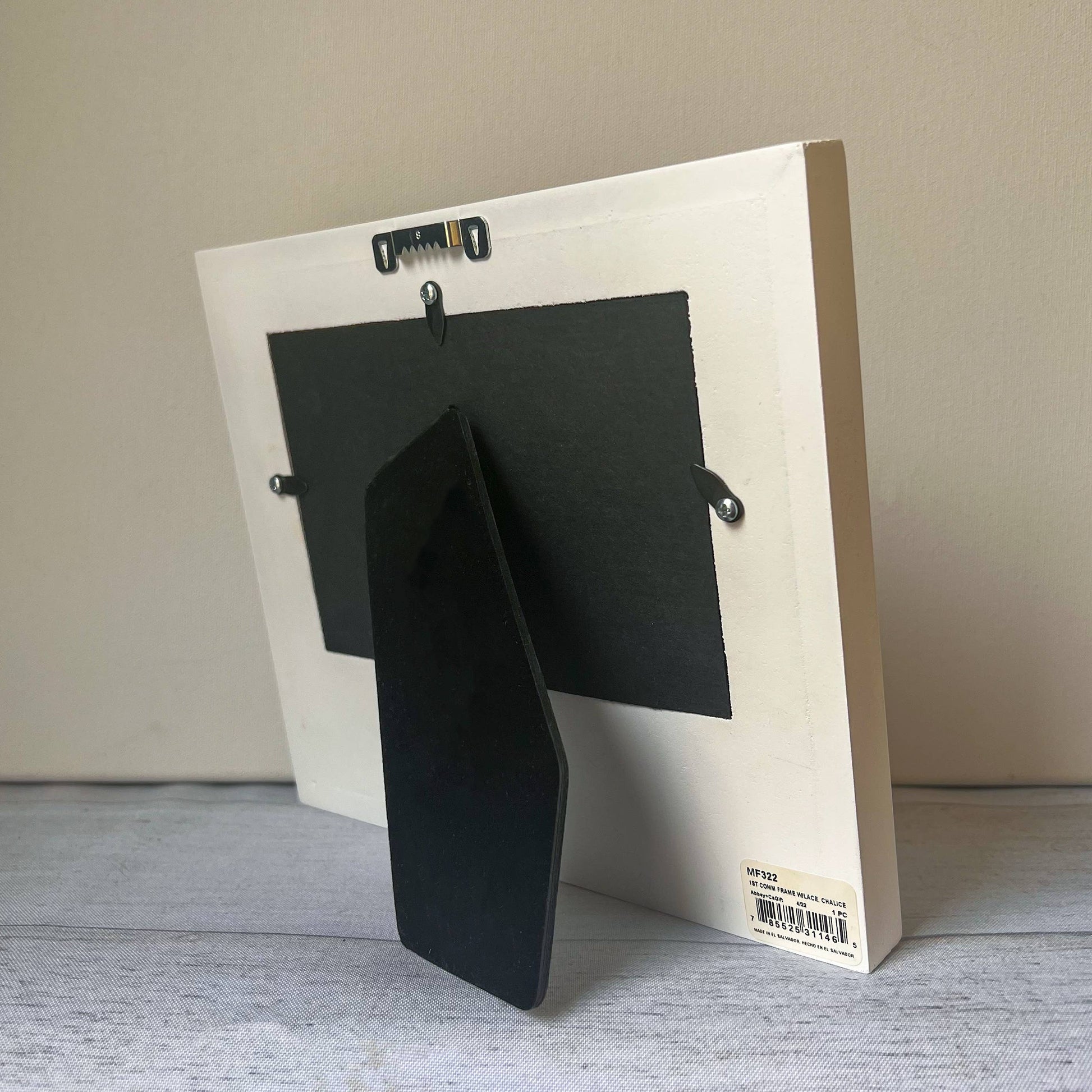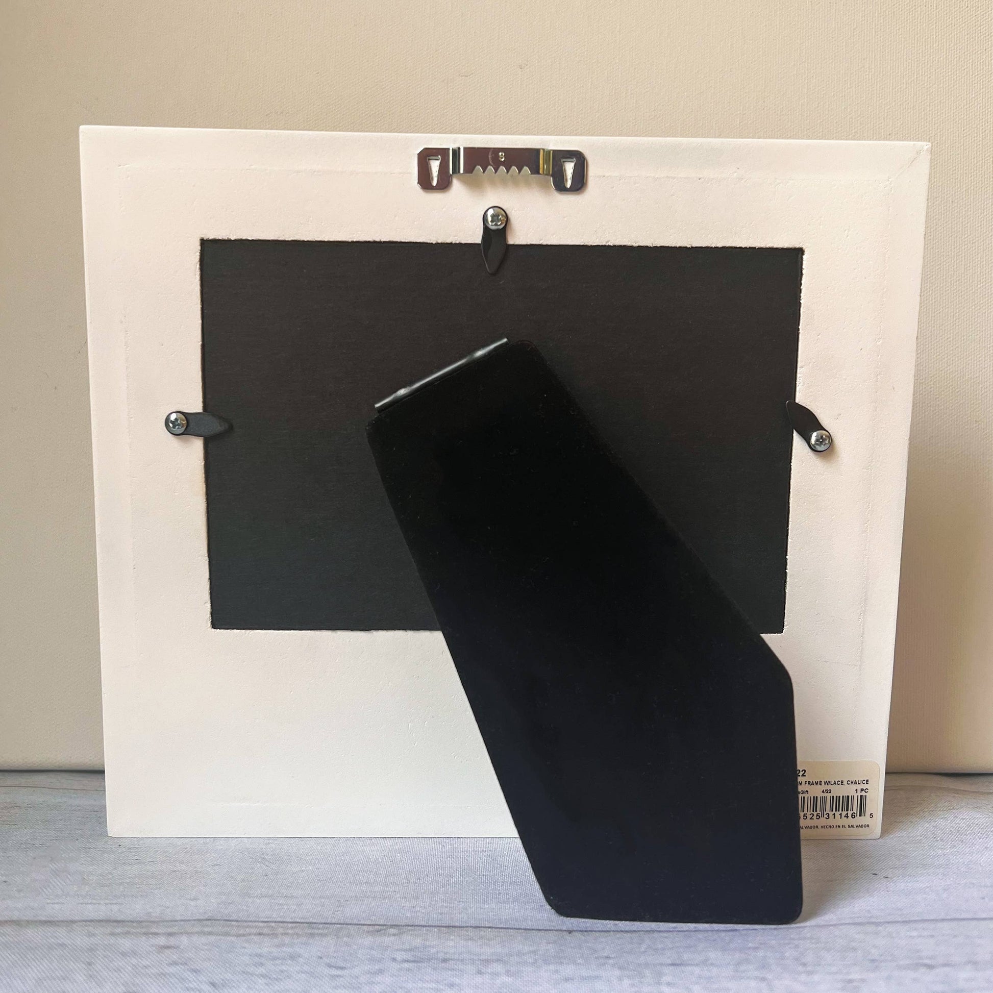 Whitewashed MDF communion frame, w/sparkling lace matte & metal chalice accent, holds 4" x 6" photo, "may our lord…" hangs/stands, boxed.