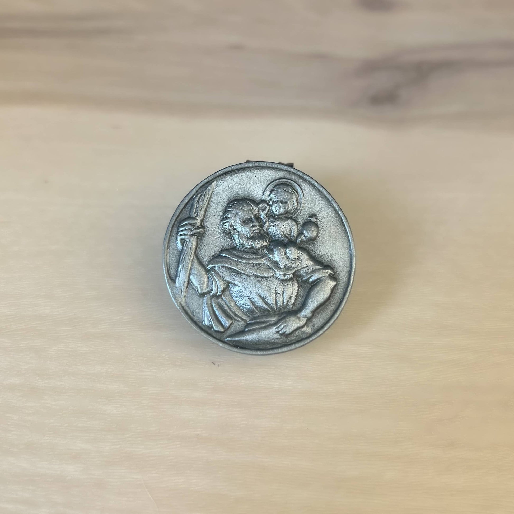 Cast metal St. Christopher Visor Clip. 1 ½” diameter.