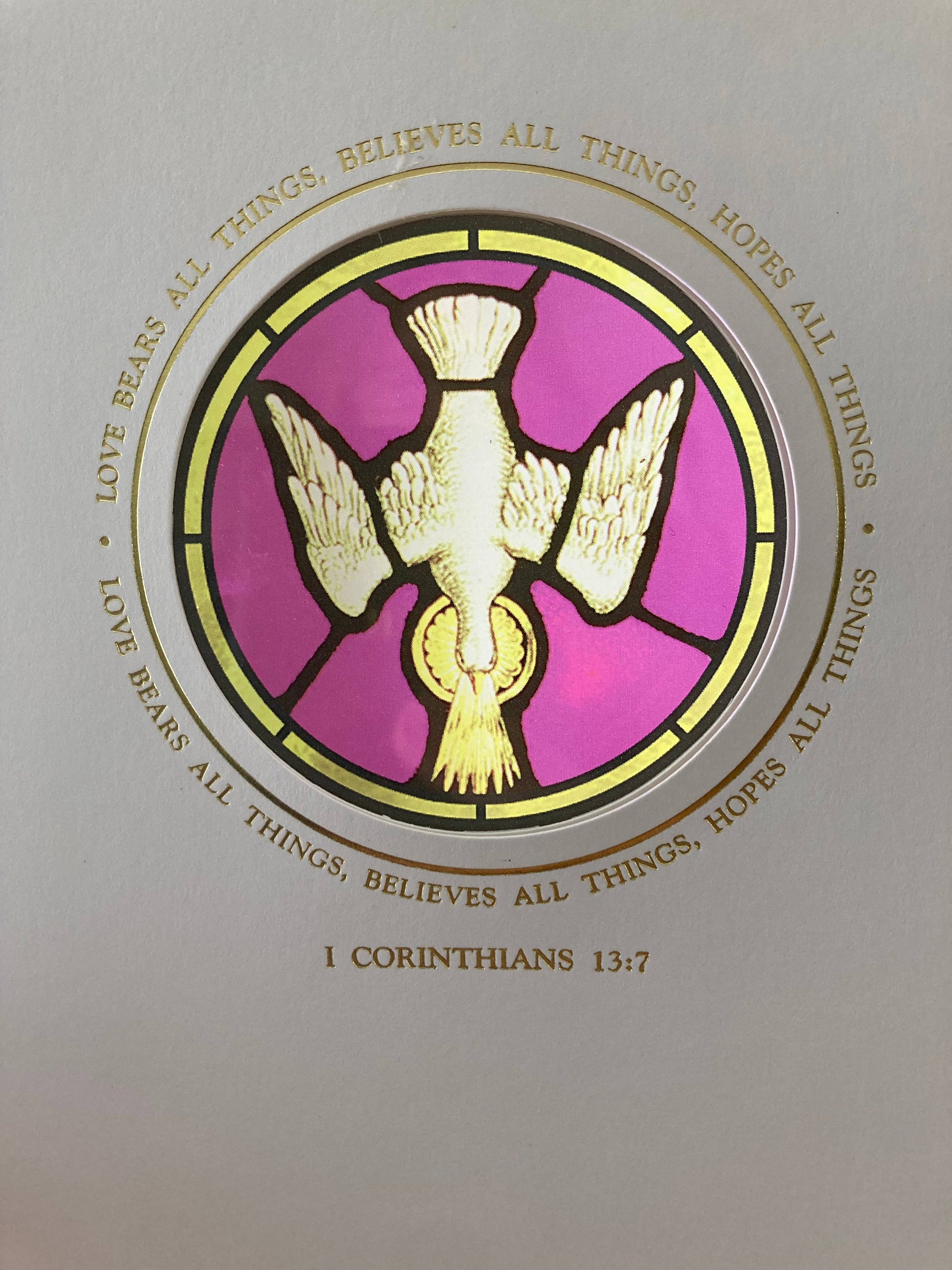 Love inspirational sun-catcher card is blank on the inside. Lettering on front is. in gold foil with scripture verse-Love Bears all things, Believes all things, Hopes all things. Place in front of a light source to let the light shine through. A pink envelope is included and is protected by a clear cellophane sleeve. This is appropriate for Valentine's Day, or any occasion.