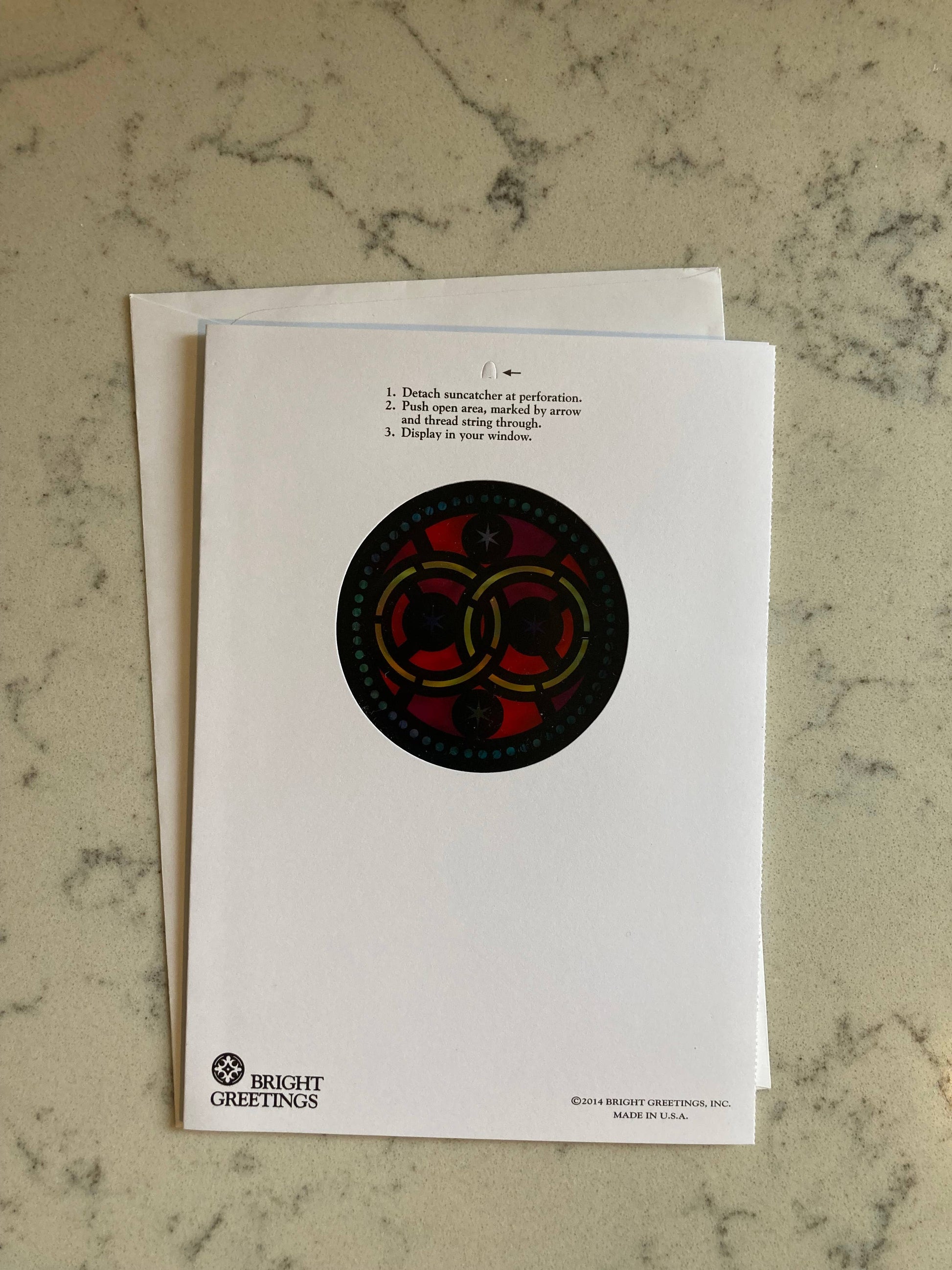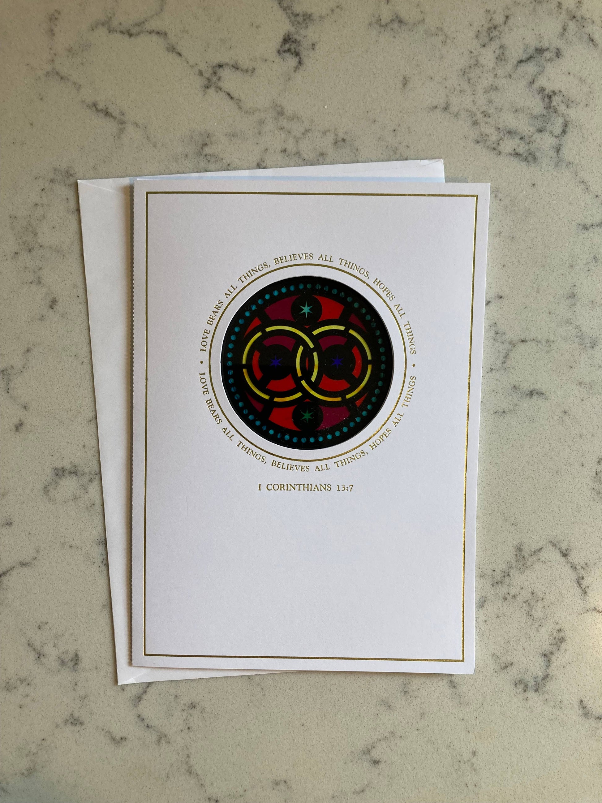 Wedding Rings sun-catcher keepsake card | Love bears all things, believes all things, hopes all things, gold foil type on front | Congratulations and best wishes on your wedding day | Cream envelope included | This window was photographed and adapted from a church in WNY. Hold card up to a light source to let the light shine through! This is a keepsake card. The card is protected by a clear sleeve.