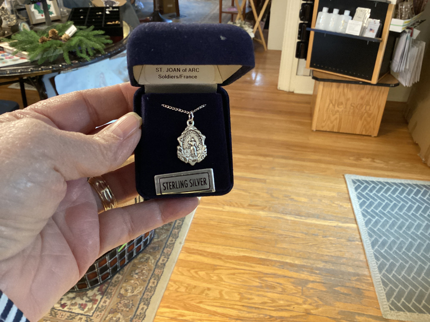 Delicately sculptured Sterling Siver St Joan of Arc medal on 18” Light curb Sterling Silver Chain.
