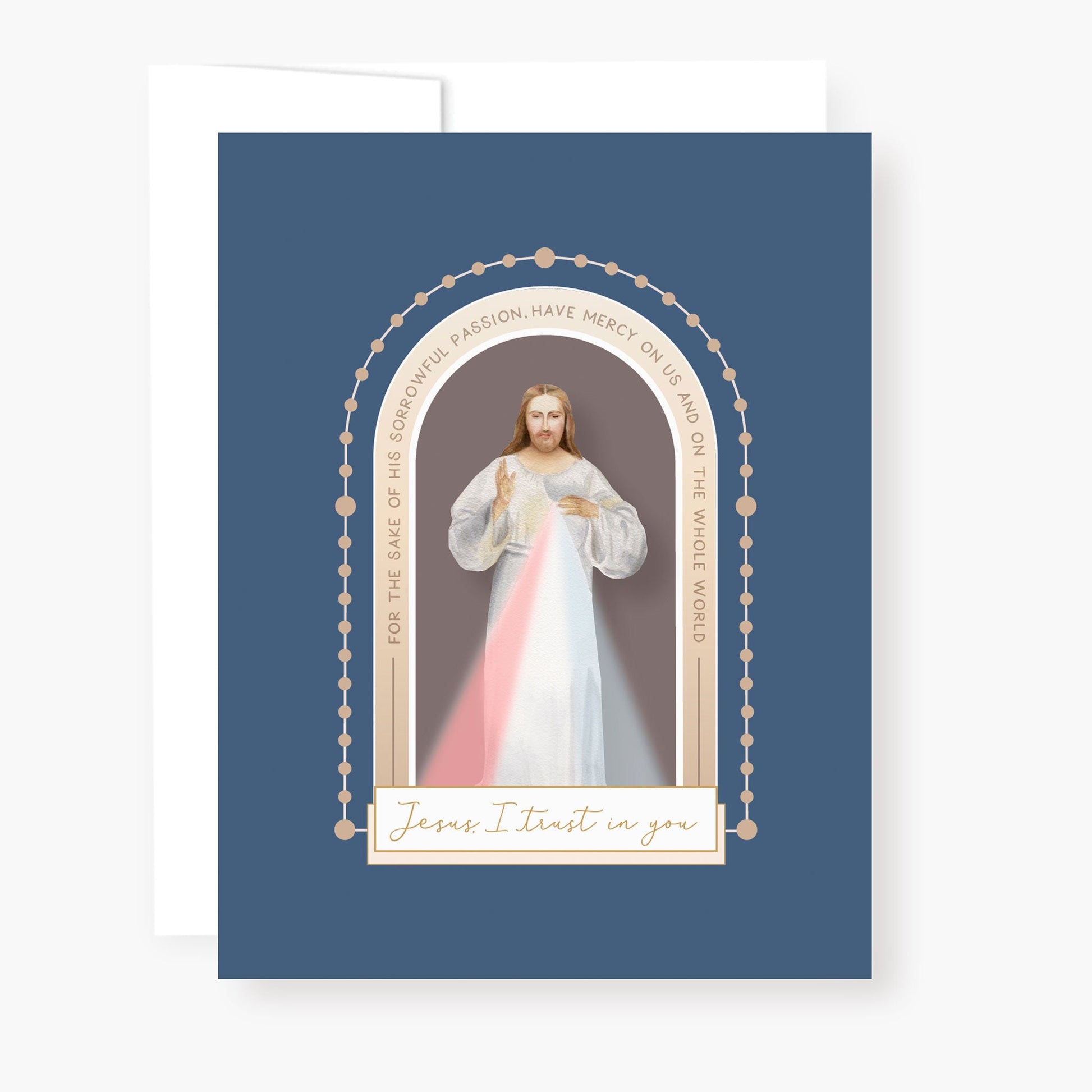 Front of Card: Divine Mercy Jesus with Arch formed by Chaplet beads and words from the Chaplet