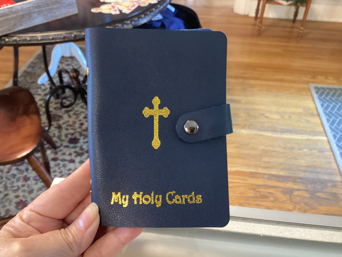 This Holy Card Holder features 20 plastic sleeves protected by a durable faux leather cover and can hold 40 back to back most standard sized paper or laminated holy cards.