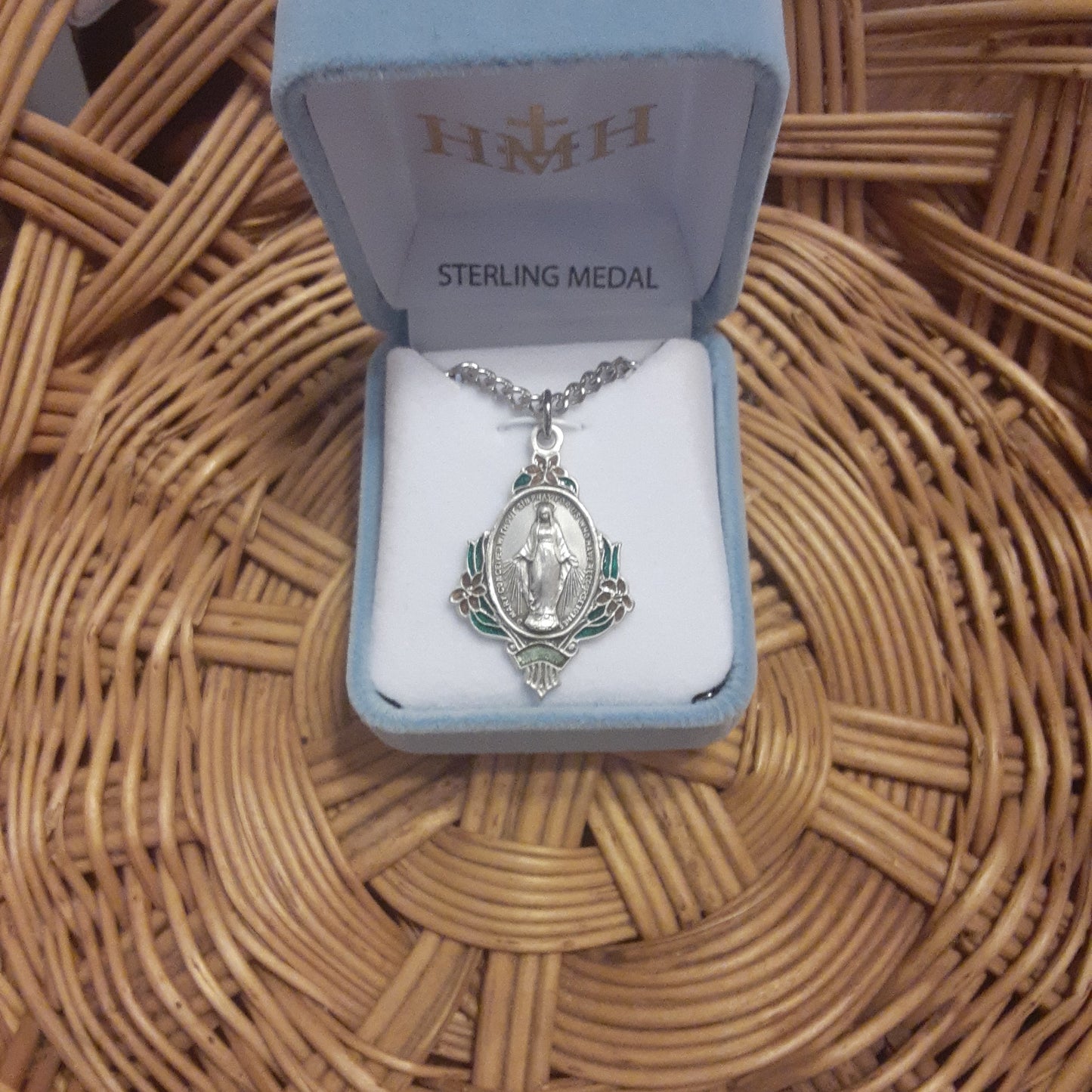 Sterling Silver 33mm Miraculous Medal with pink epoxy Flowers- 24” chain