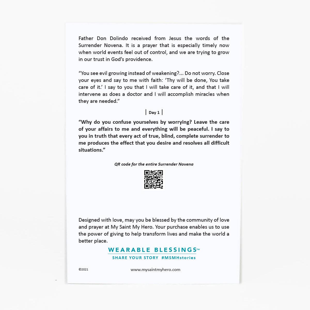On an inspirational card with Day 1 of the Novena and the QR Code for the complete Surrender Novena Download.