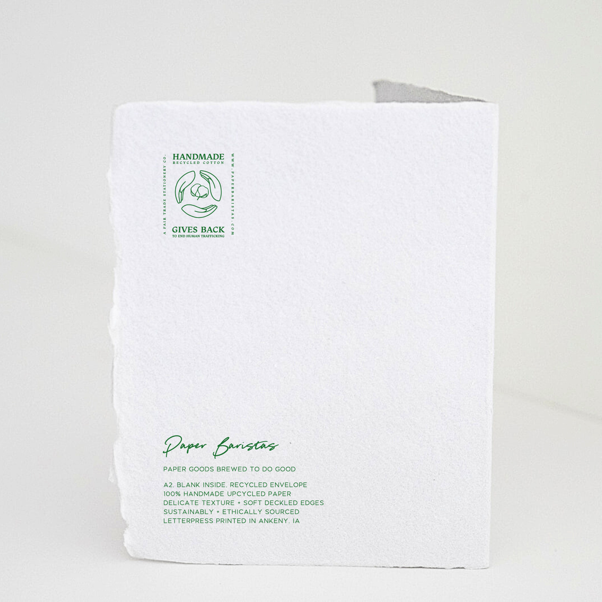 Our handmade deckled edge paper collection is letterpress printed in-house late at night with lots of coffee. This card is meant to be treasured for years to come. Handmade paper beautiful enough to frame and helps us ensure there was no slave labor in our supply chain.