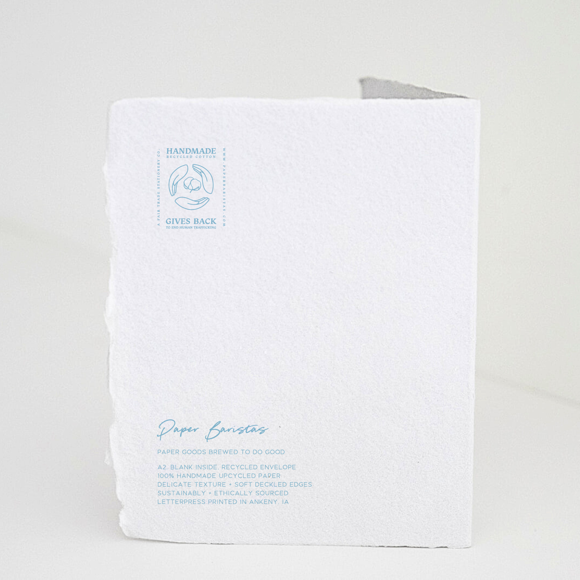 Our handmade deckled edge paper collection is letterpress printed in-house late at night with lots of coffee. This card is meant to be treasured for years to come. Handmade paper beautiful enough to frame and helps us ensure there was no slave labor in our supply chain.