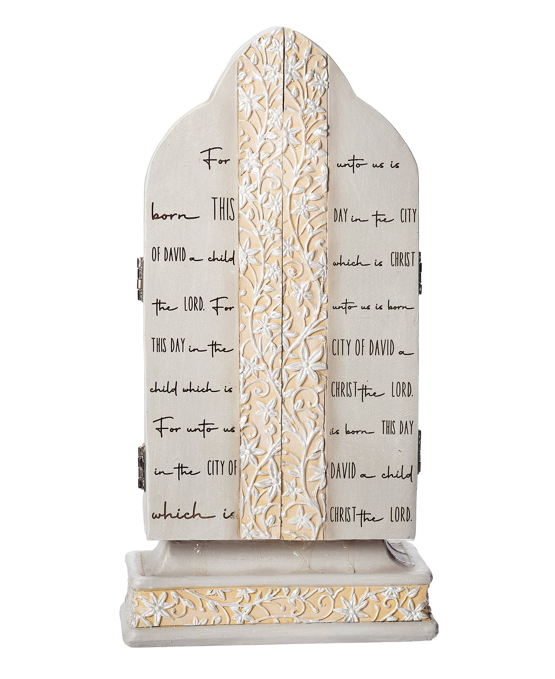 This beautifully crafted resin triptych features the Holy Family at its center with the words “For Unto Us” inscribed across the panels. With a classic design and rich detail, it makes a meaningful addition to Christmas and nativity displays.
