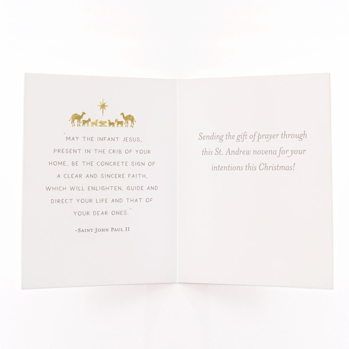 - Inside left of card: St. John Paul II quote about the Infant Jesus