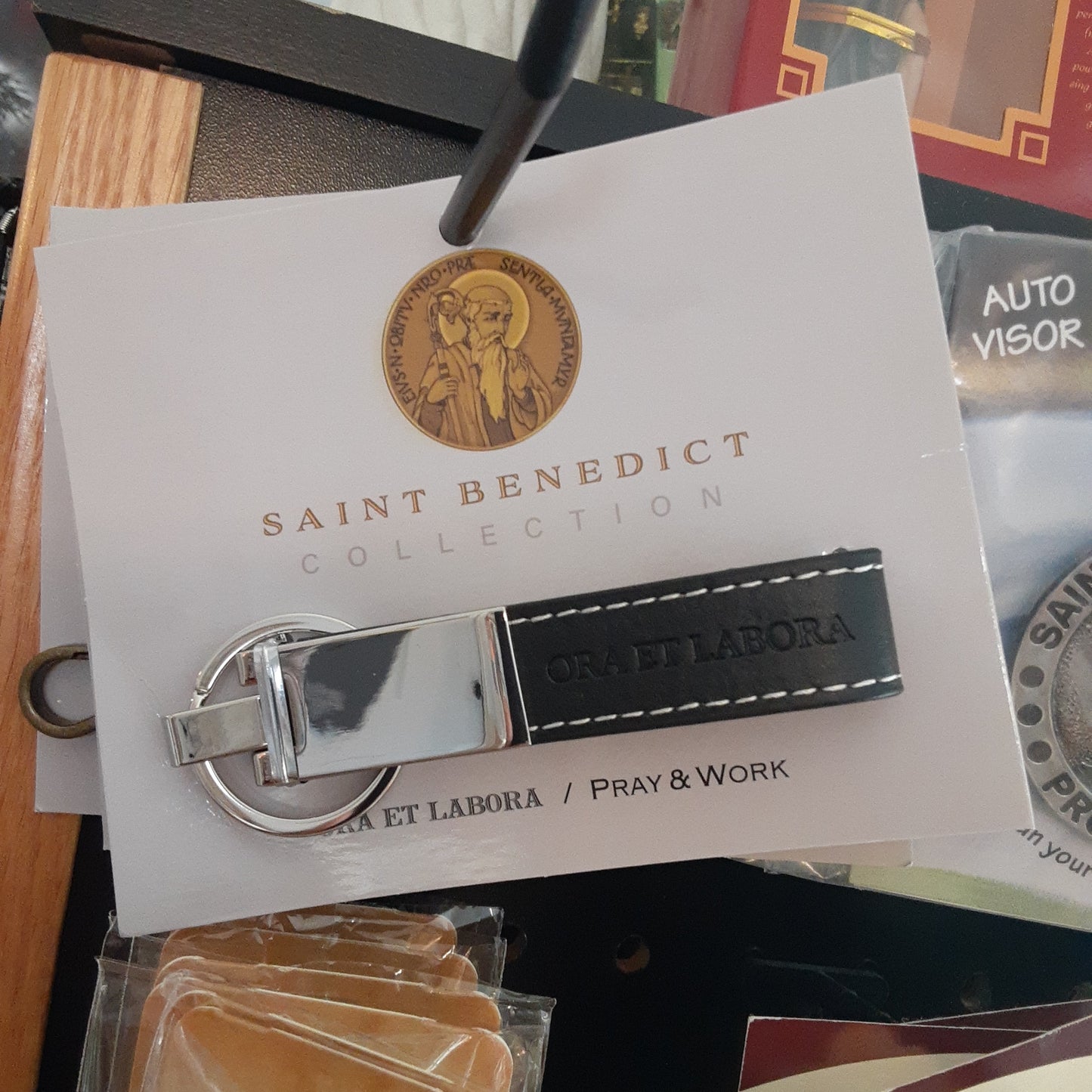 Leather strap keychain embossed with ORA ET LABORA / PRAY & WORK