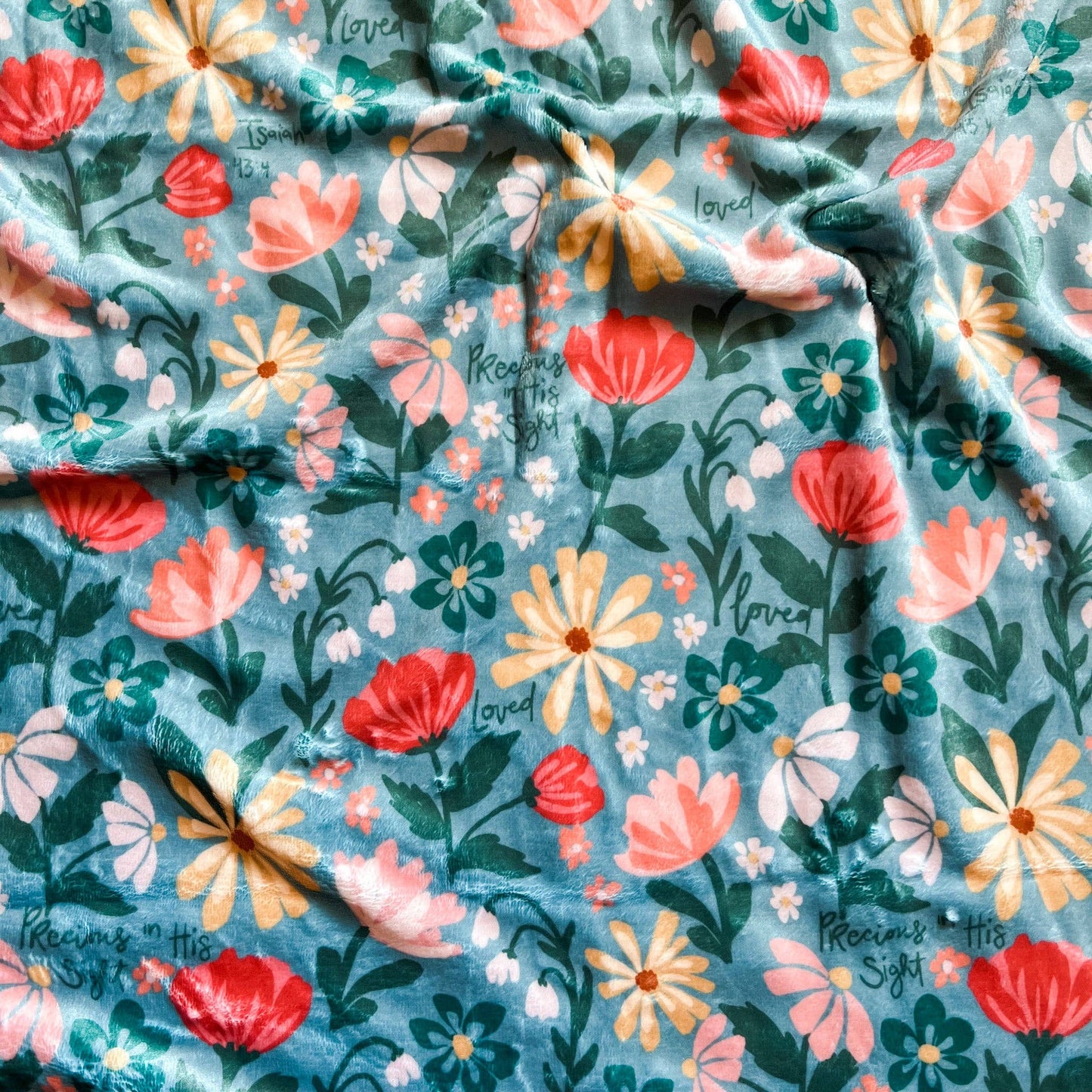 Blanket has beautiful floral pattern with words "Loved" and "Precious in His Sight" scattered throughout to remind you of your worth and value!