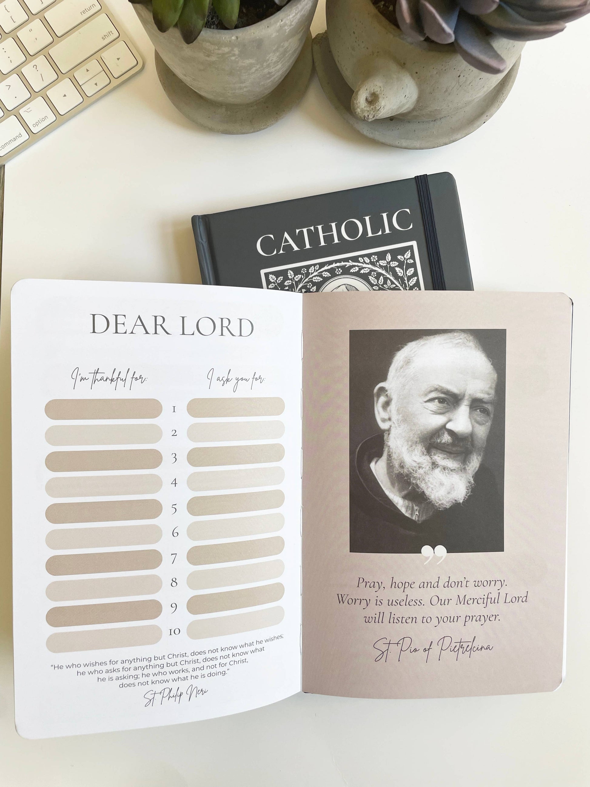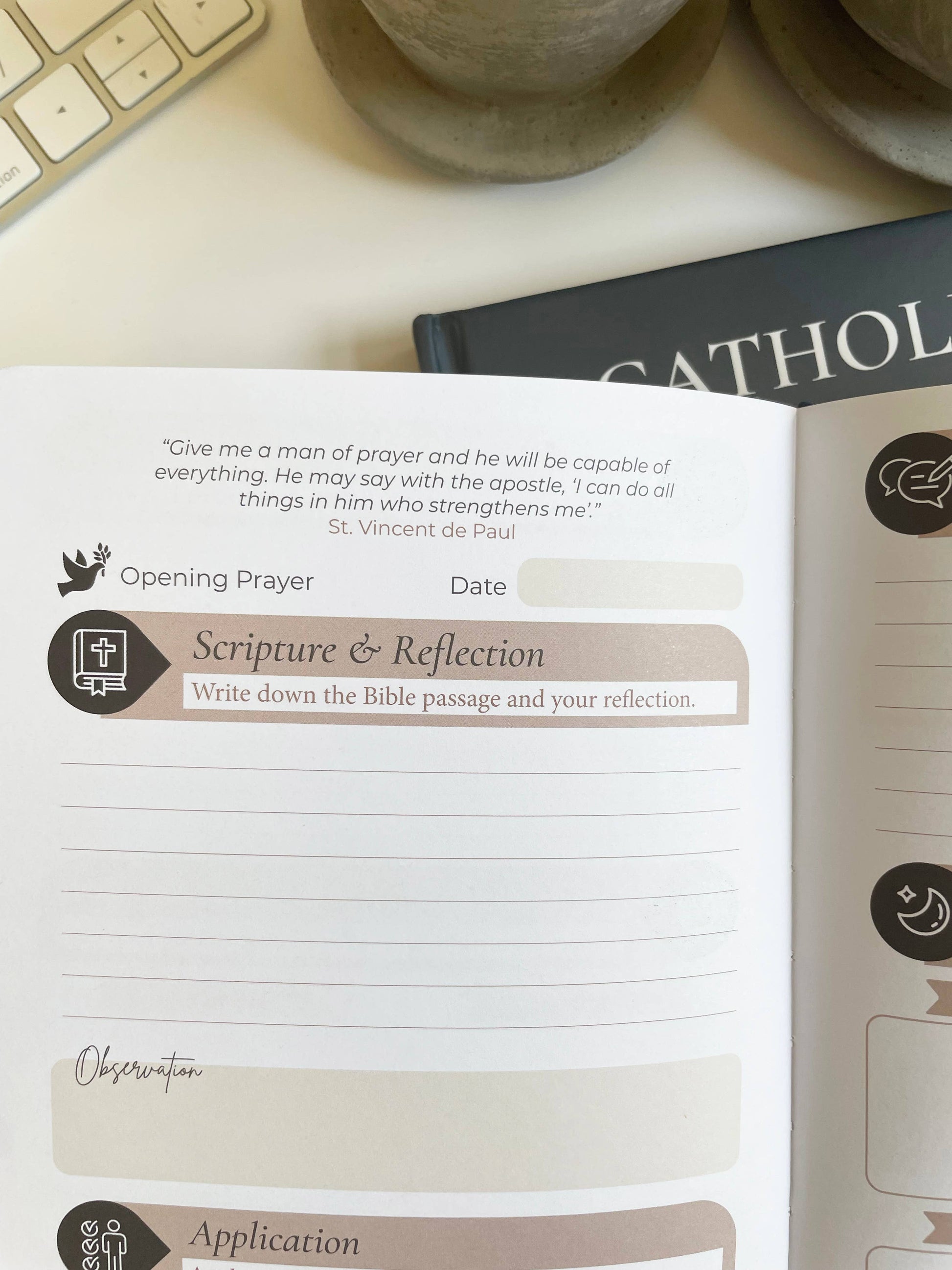 This Catholic Prayer Journal is a 3 month guided devotional through Scripture and the Saints. The journal includes Bible verses and quotes from the Saints to help you get closer to Christ.